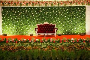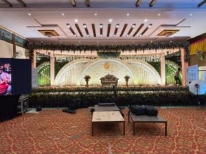 Our massive convention hall is 100ft L x 80ft W x 20ft H, accommodating 500+ guests comfortably for wedding halls in Bengaluru.